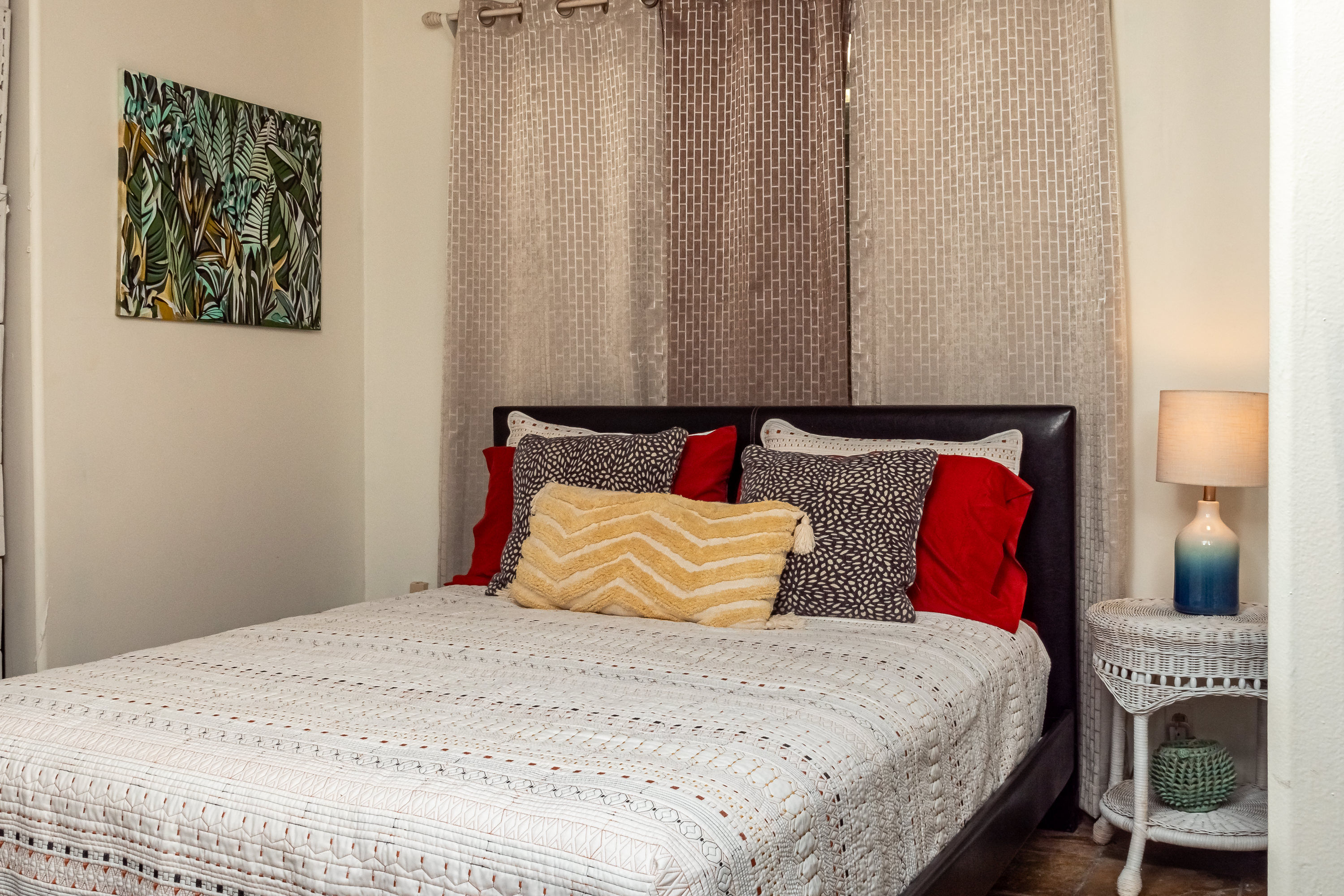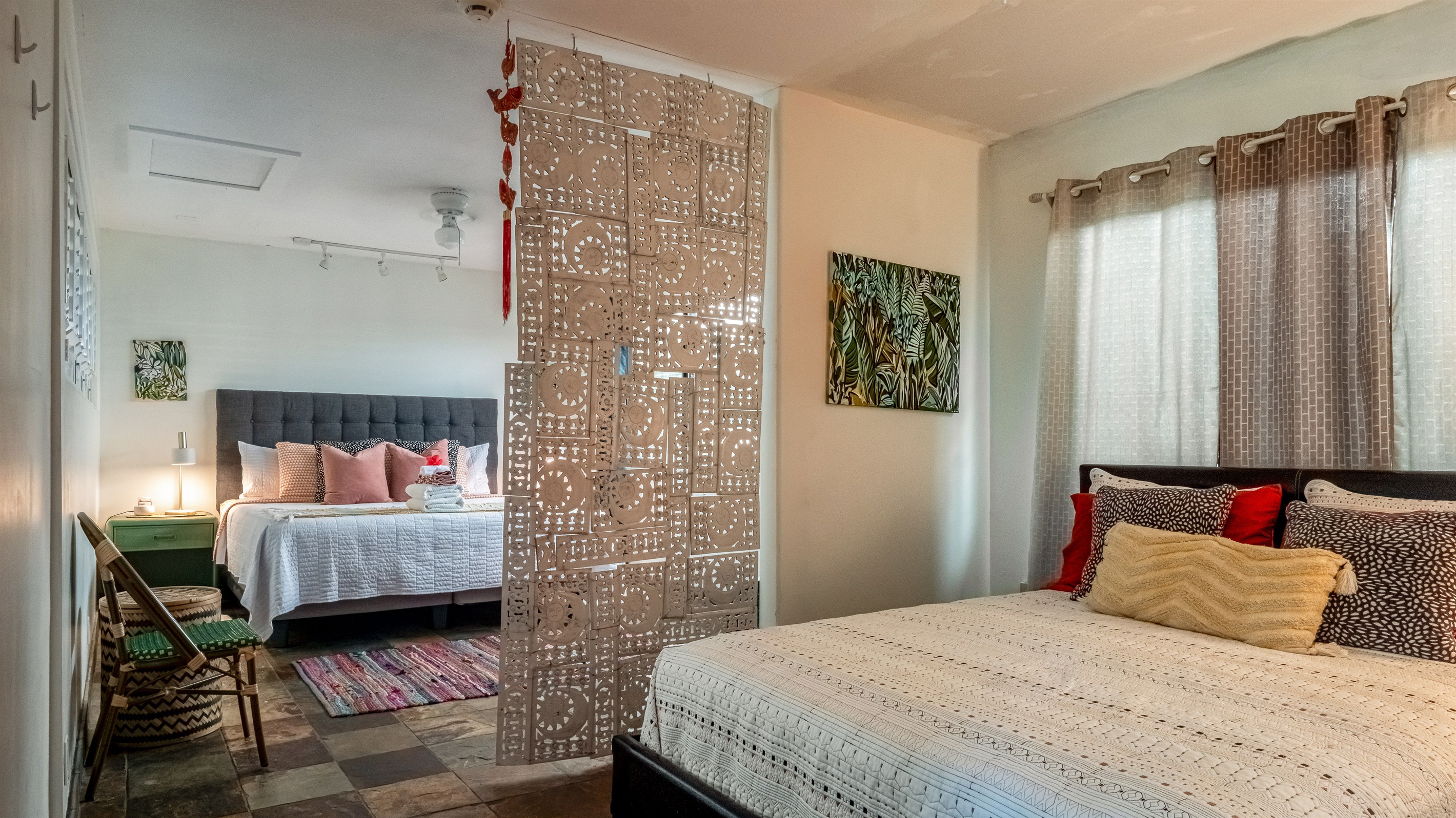 * Cal King + Queen Bed separated by a half-wall + room divider