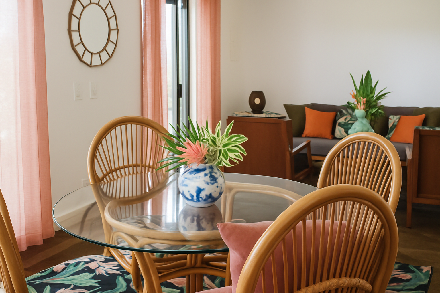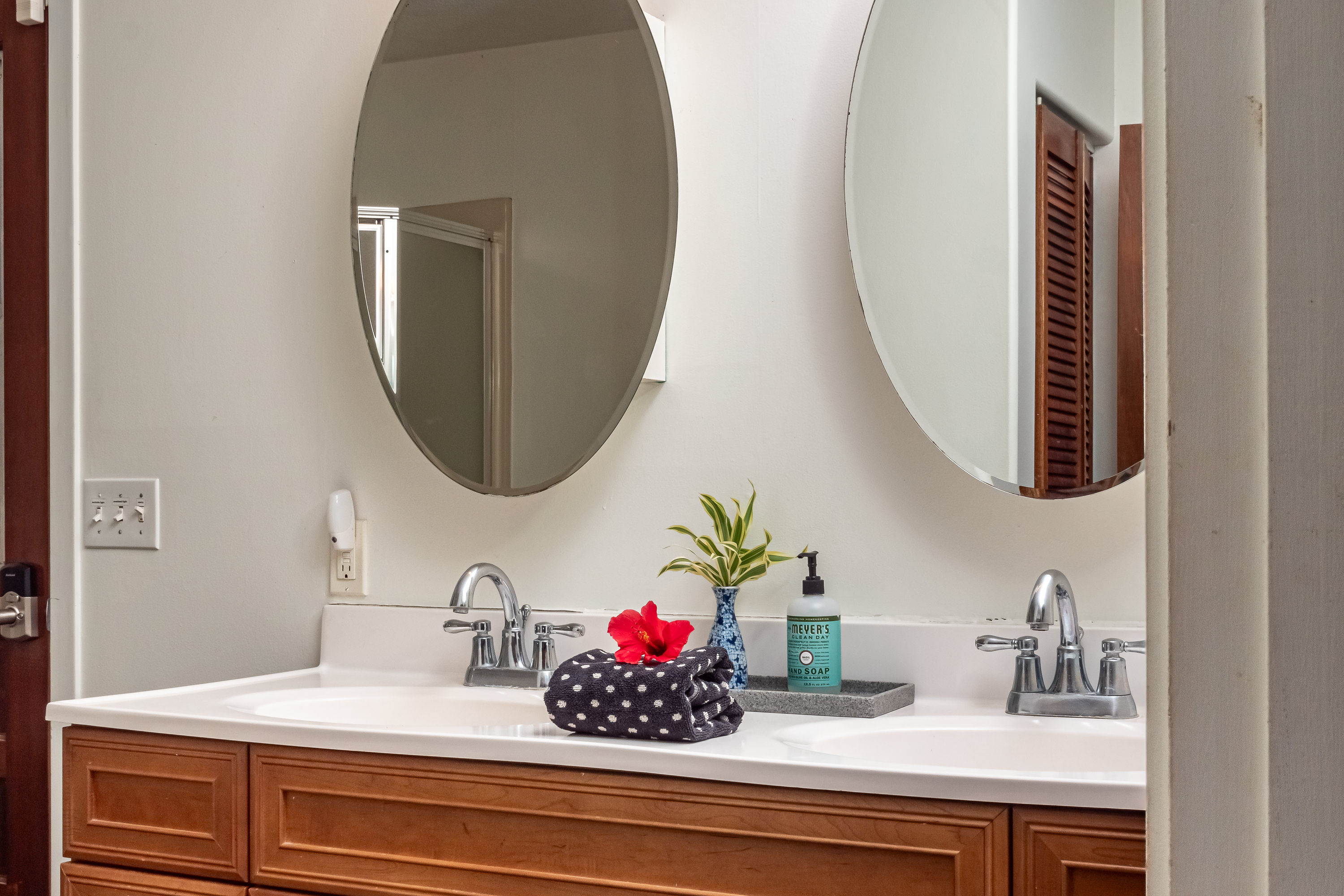 This ground-level retreat features a private entrance and parking. Soak in the serene country living experience as you pick fresh tropical fruit from our trees, including mango, lychee, and avocado. Perfect for couples or families, featuring a fully equipped kitchen and an outdoor seating area. The large bedroom boasts a California King bed and a Queen Bed separated by a room divider, each beneath ceiling fans to keep you cool at night. The bathroom includes double sinks and a standing shower, with an outdoor shower nearby, ideal for rinsing off after a day at the beach. A private washer and dryer are designated for exclusively for your laundry needs during your stay.